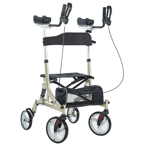 Designed with a firm, 1.3″ thick padded seat and a larger-than-average 19″x14″ seating area, this walker offers enhanced comfort during breaks. It also includes sit-to-stand handles and a cane/umbrella holder, making it ideal for seniors seeking both support and convenience.